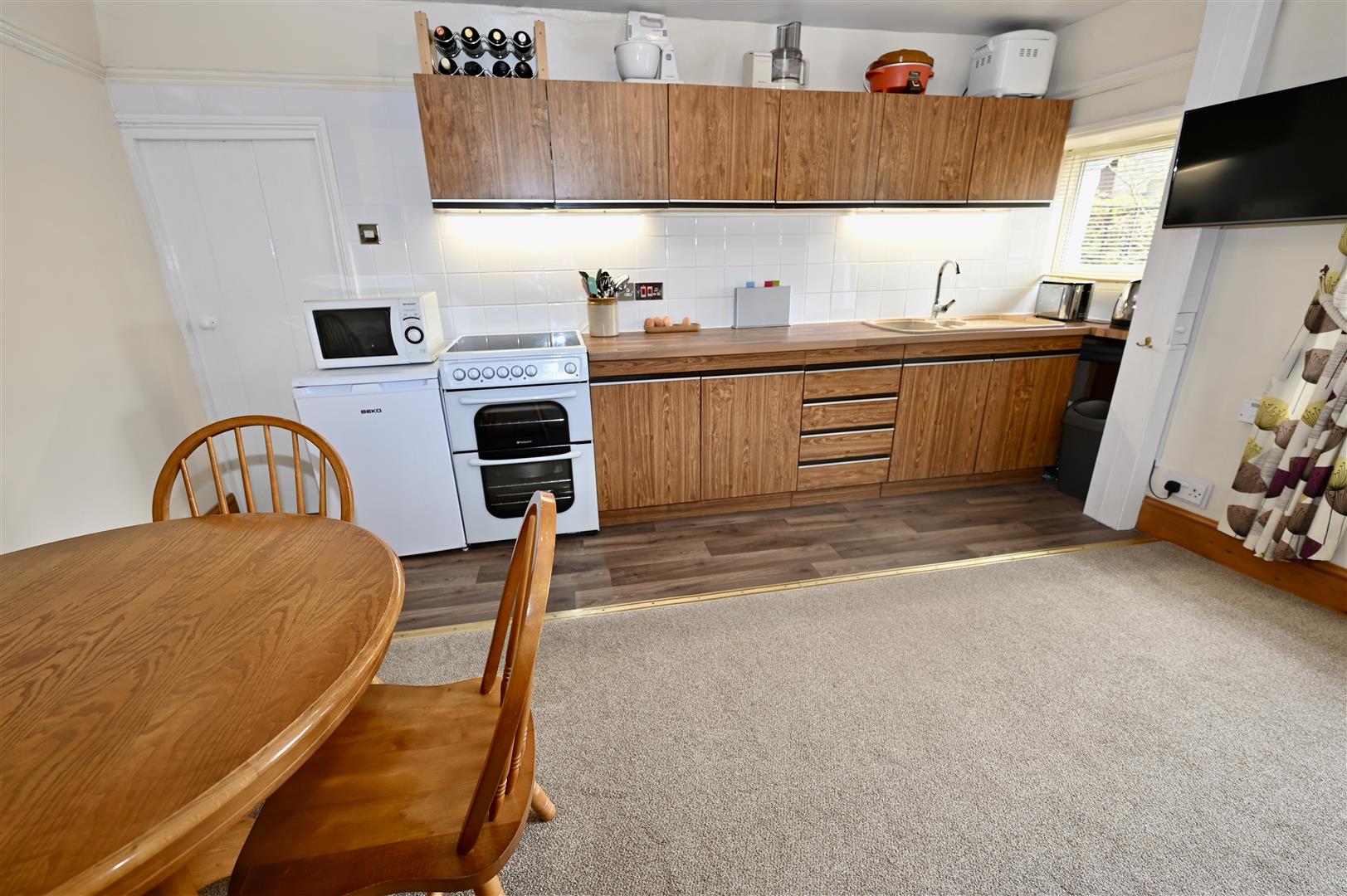 Plumbing for a washing machine with worktop over and a stainless steel sink unit. Partially double glazed wooden door leading to the side of the property. Electric radiator and double glazed windows.