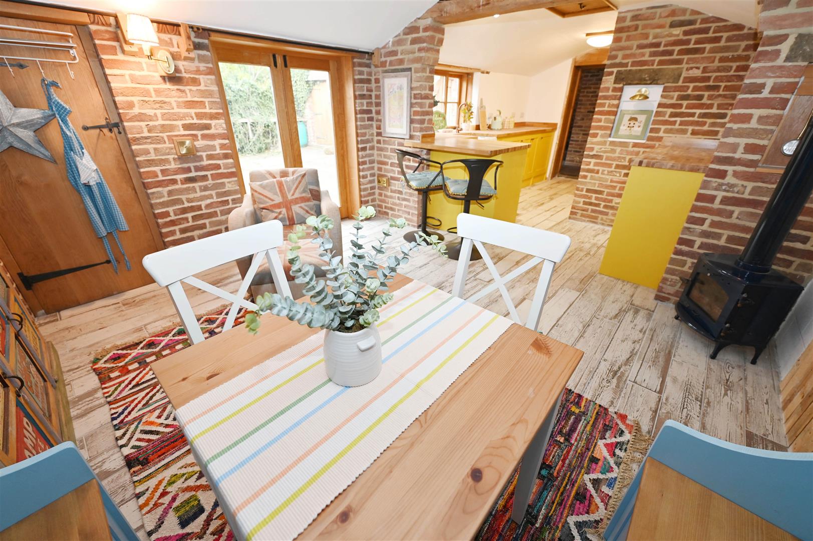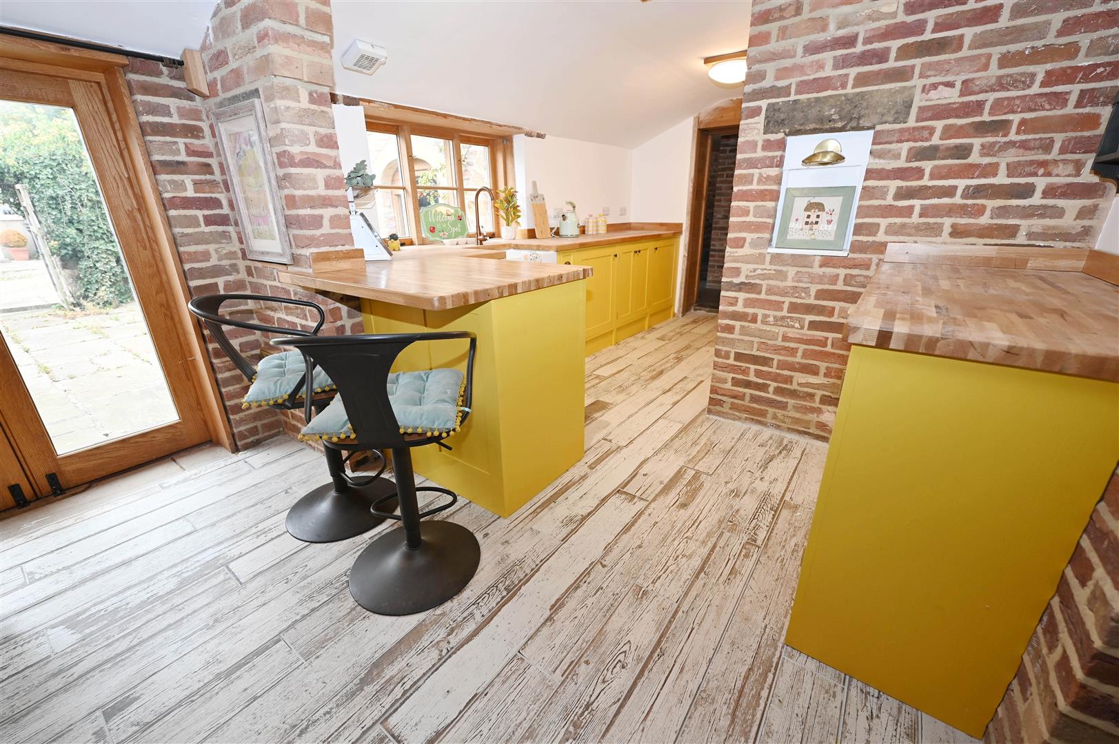 STUNNING & BESPOKE: Fitted with hand-made units with woodblock worktops & Belfast sink, range cooker, fridge & freezer. Woodburning stove, exposed brick & stone feature Fitted pew-bench & attractive flooring. Window & French doors open on to the Private to Courtyard Patio.