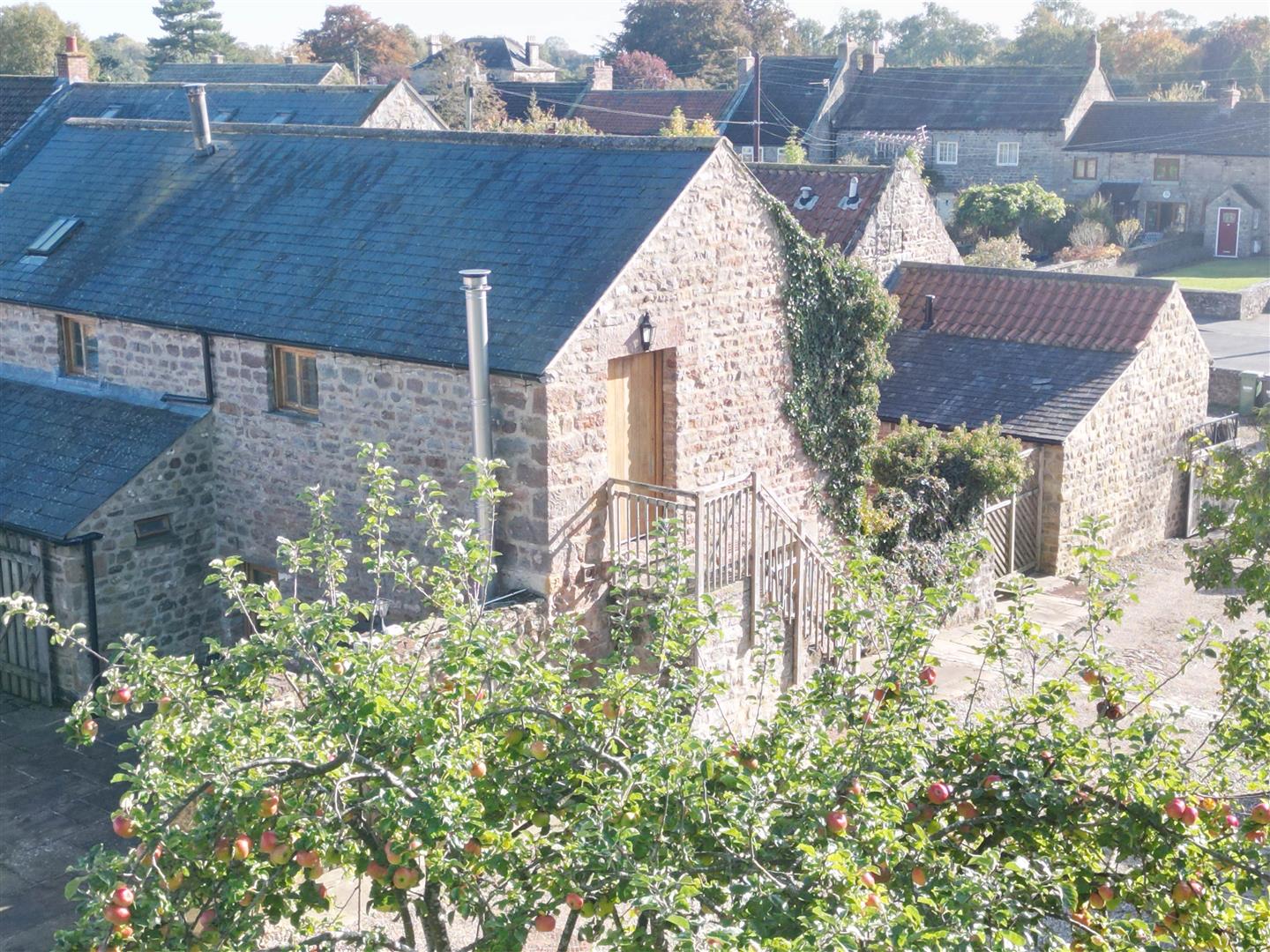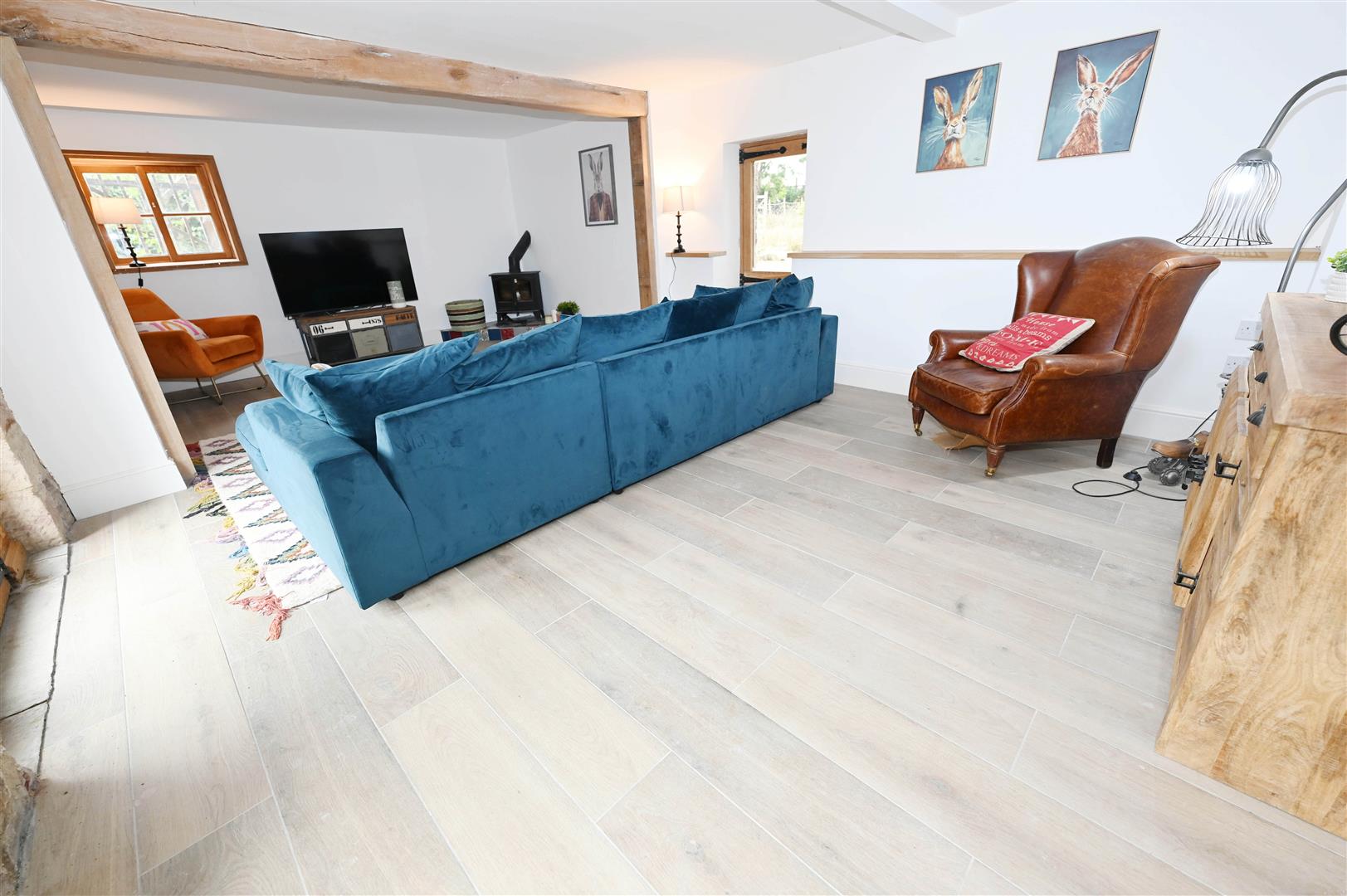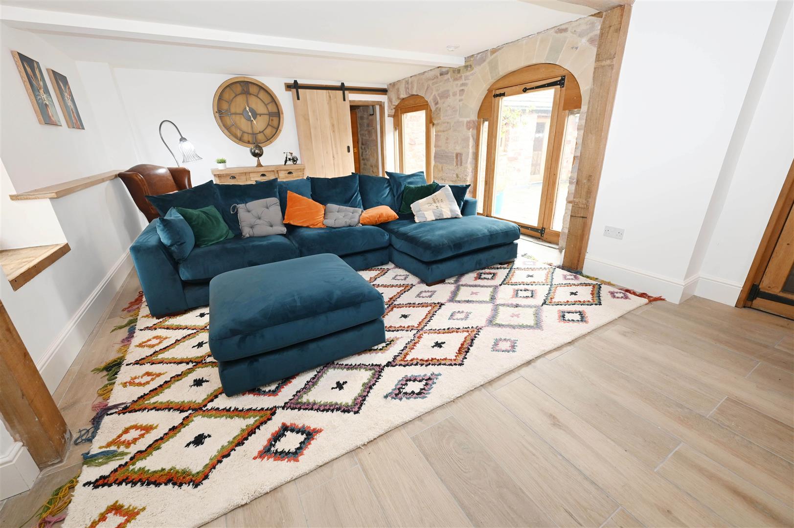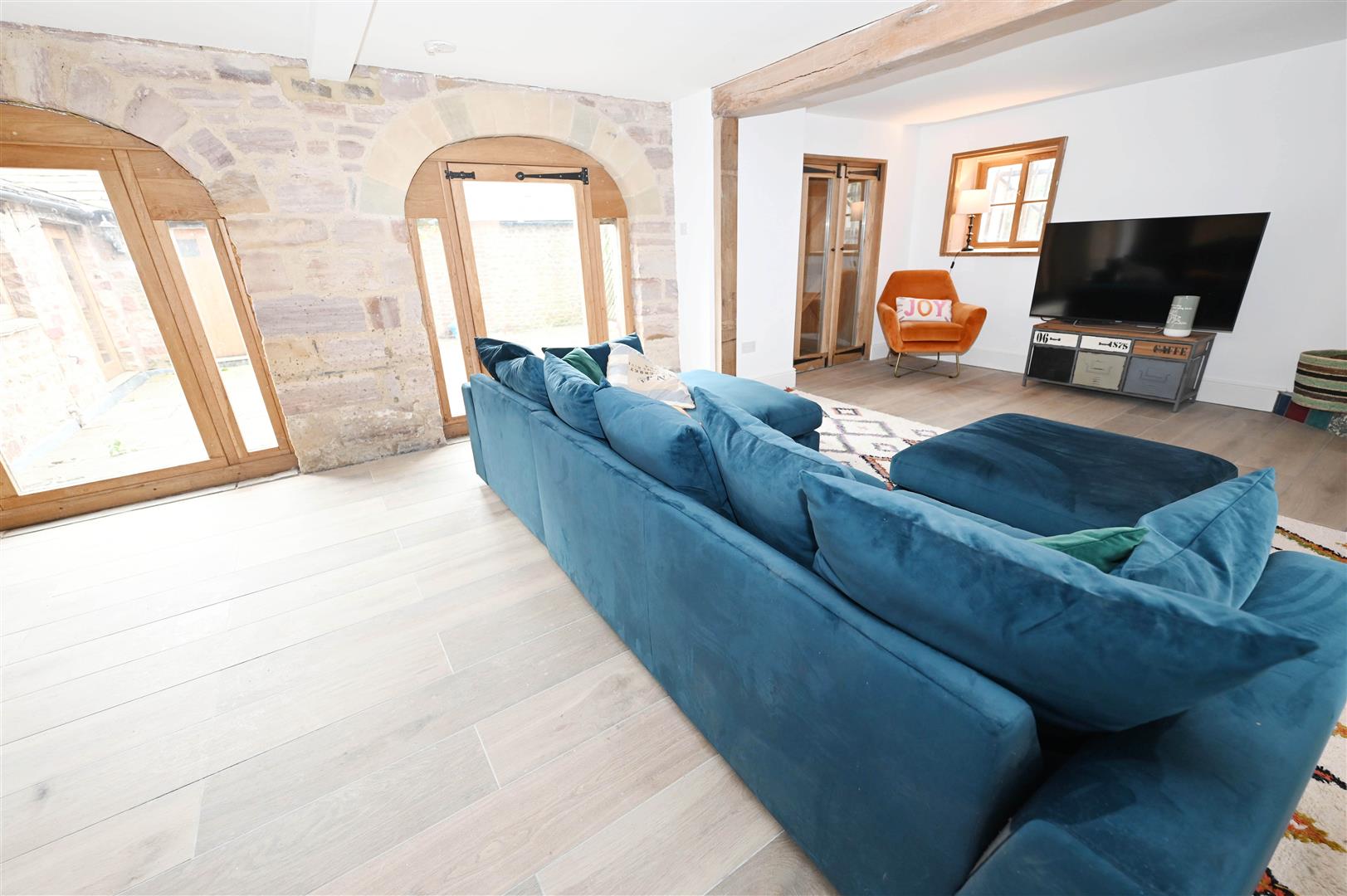 Woodburning stove, exposed stone features & stone arched framed windows & door to private courtyard. Oak finish flooring & ledges. A dual-aspect room.