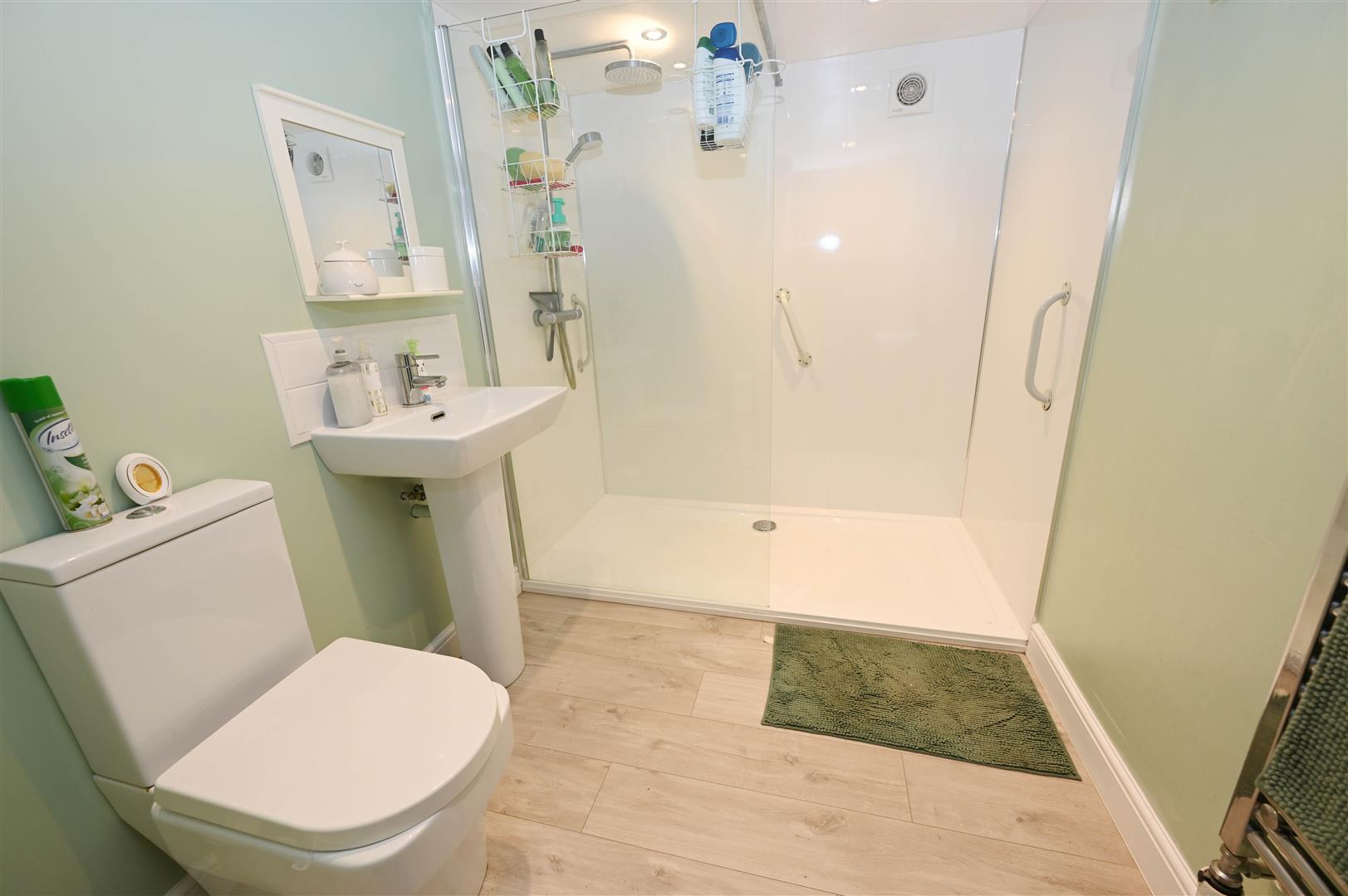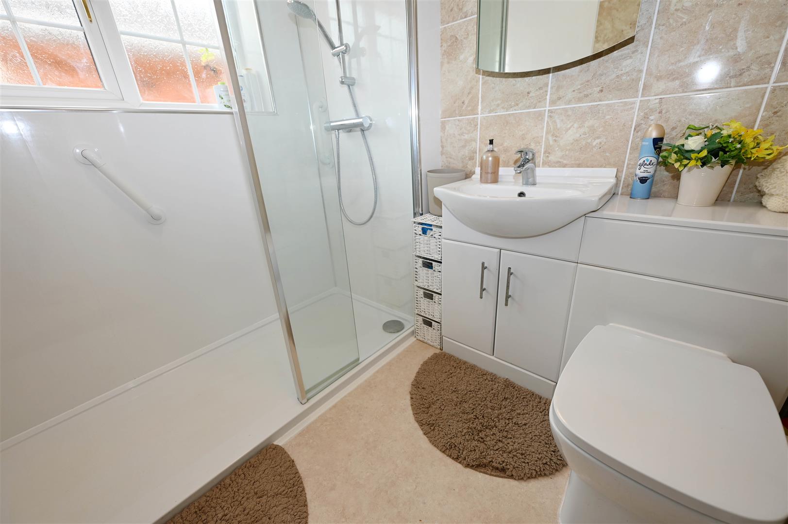 Contemporary suite with glazed shower area, inset washbasin with cupboards under & WC. UPVC double-glazed window to side.