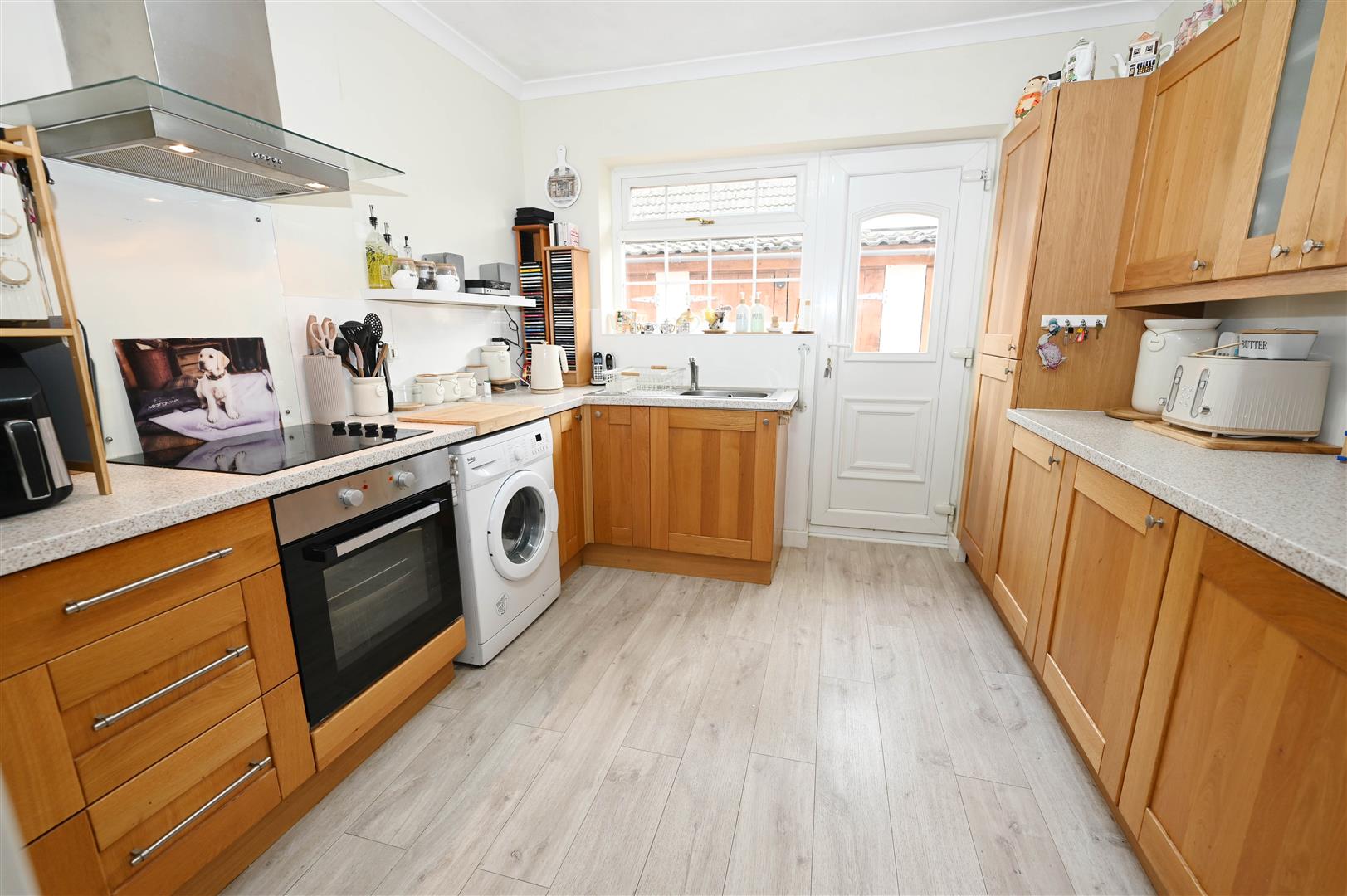 Oak wall & floor units with worktops & inset sink unit; integrated electric oven & ceramic hob with stainless steel & glazed extractor over, plumbing for washing machine & UPVC double-glazed window & door to side.