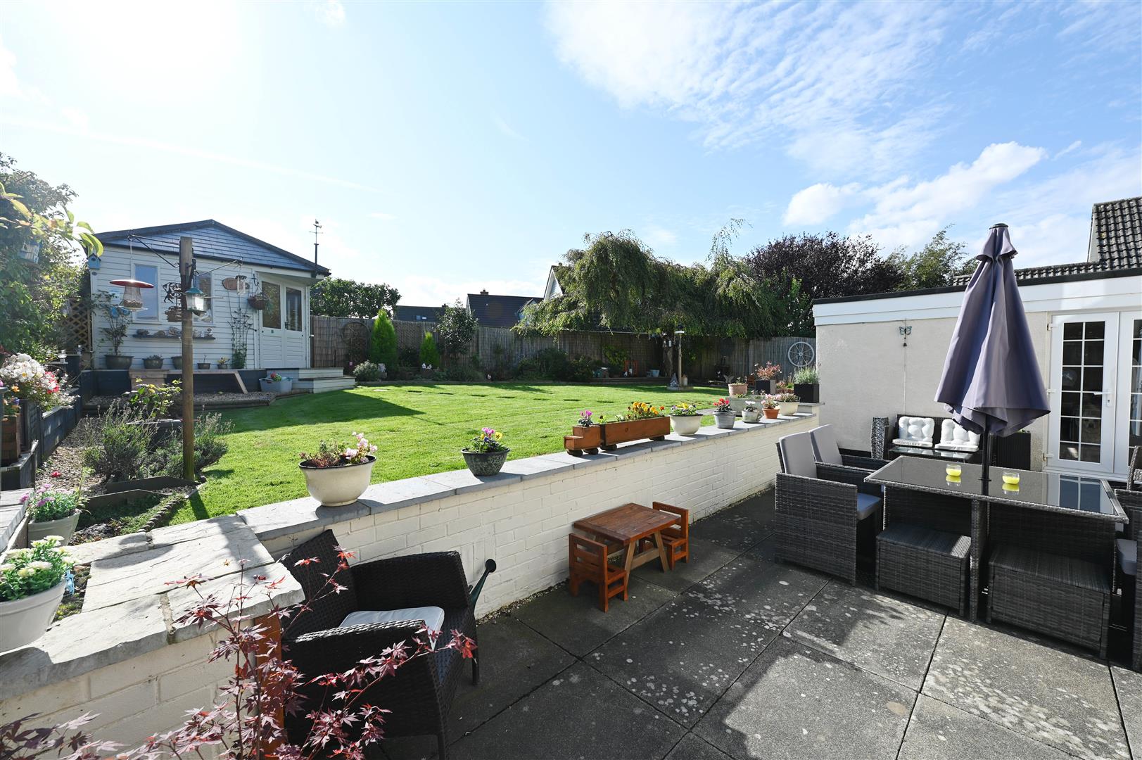 Stone boundary wall & double-width 4-car drive, lawn with flower bed & Sitting Area. Side gate to rear.
