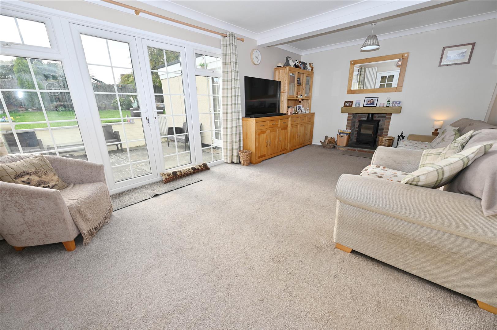 Recessed multi-fuel stove with timber mantel & brick surround. UPVC double-glazed patio doors with side screens to rear & double doors to: