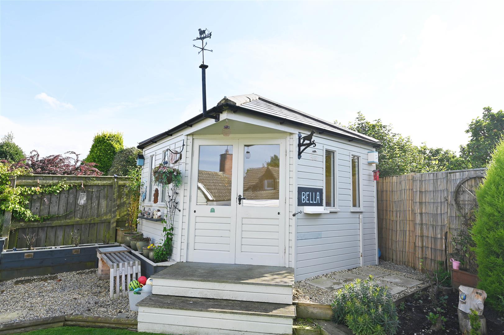 The enclosed gardens include a 3.47m x 3.45m/11'4" x 11'3" SUMMER HOUSE/STUDIO/GYM etc with light, power & double-glazed windows & doors. Large flagged patio & lawn with flower/shrub borders, cold water tap & outside light point, 4 STORE SHEDS with double doors & outside power socket.