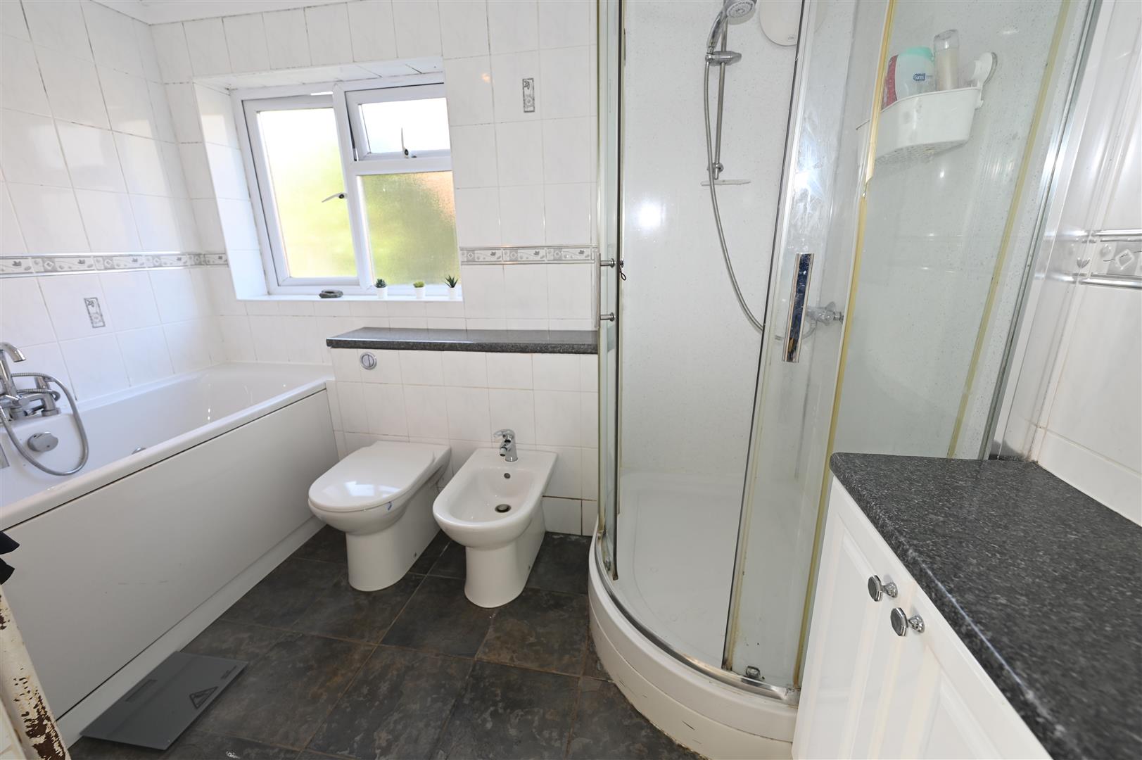 Having a white suite comprising of corner shower cubicle with Mira shower, panelled bath with shower attachment over, bidet, w.c, wash hand basin with a vanity store cupboard beneath, tiled floor, spot lights, heated towel radiator, coving, tiled walls and a UPVC double glazed window.