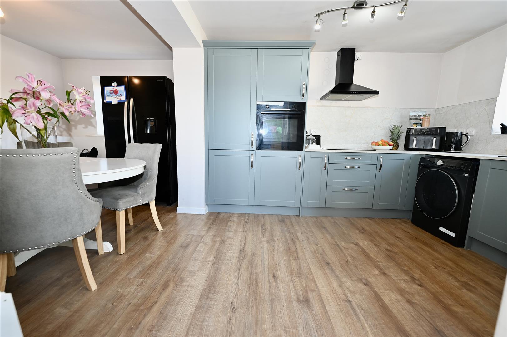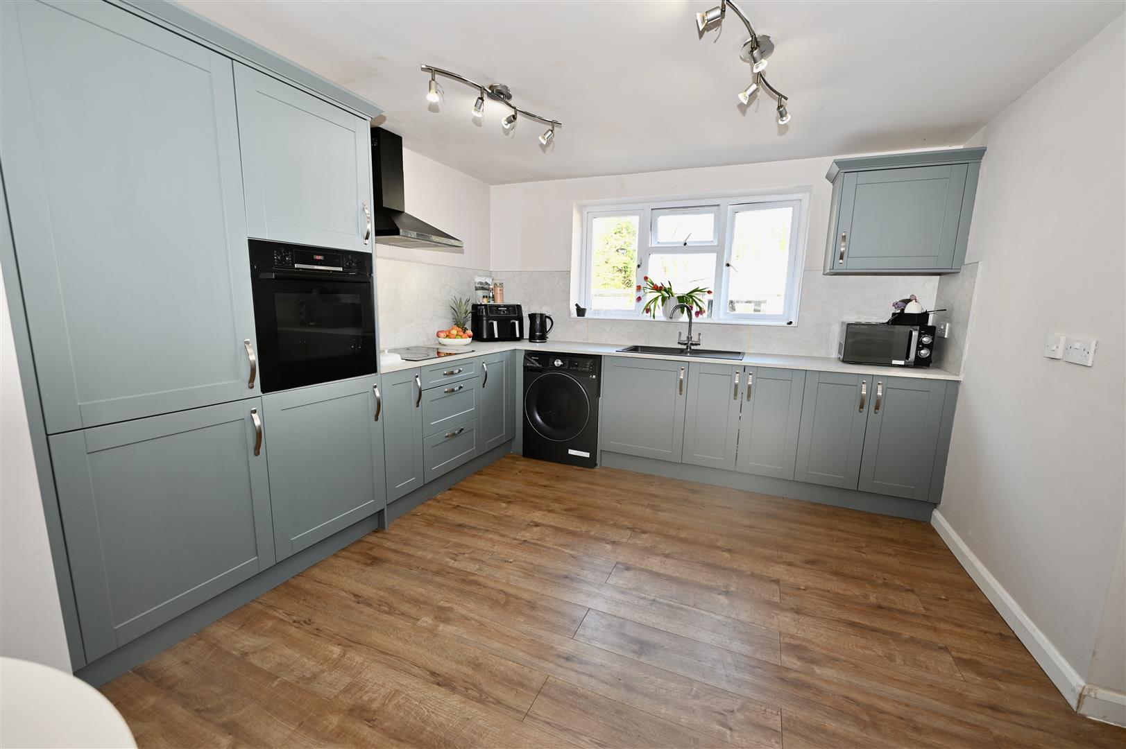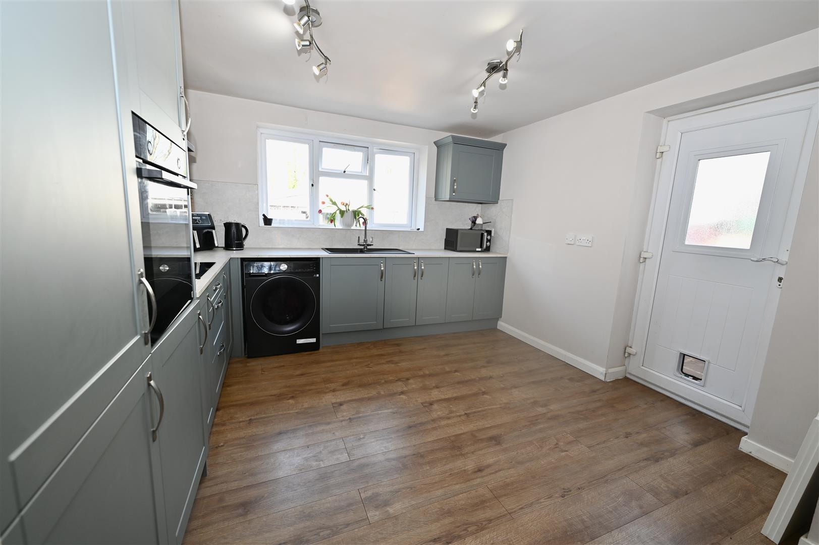 With a range of wall, base and drawer units with worktops and splash backs, Bosch tower oven, electric hob with extractor fan over, plumbing for a washing machine, Worcester combi boiler, wooden effect flooring, central heating radiator and under stairs store cupboard. There is a UPVC double glazed door leading out to the rear garden and a UPVC double glazed window.