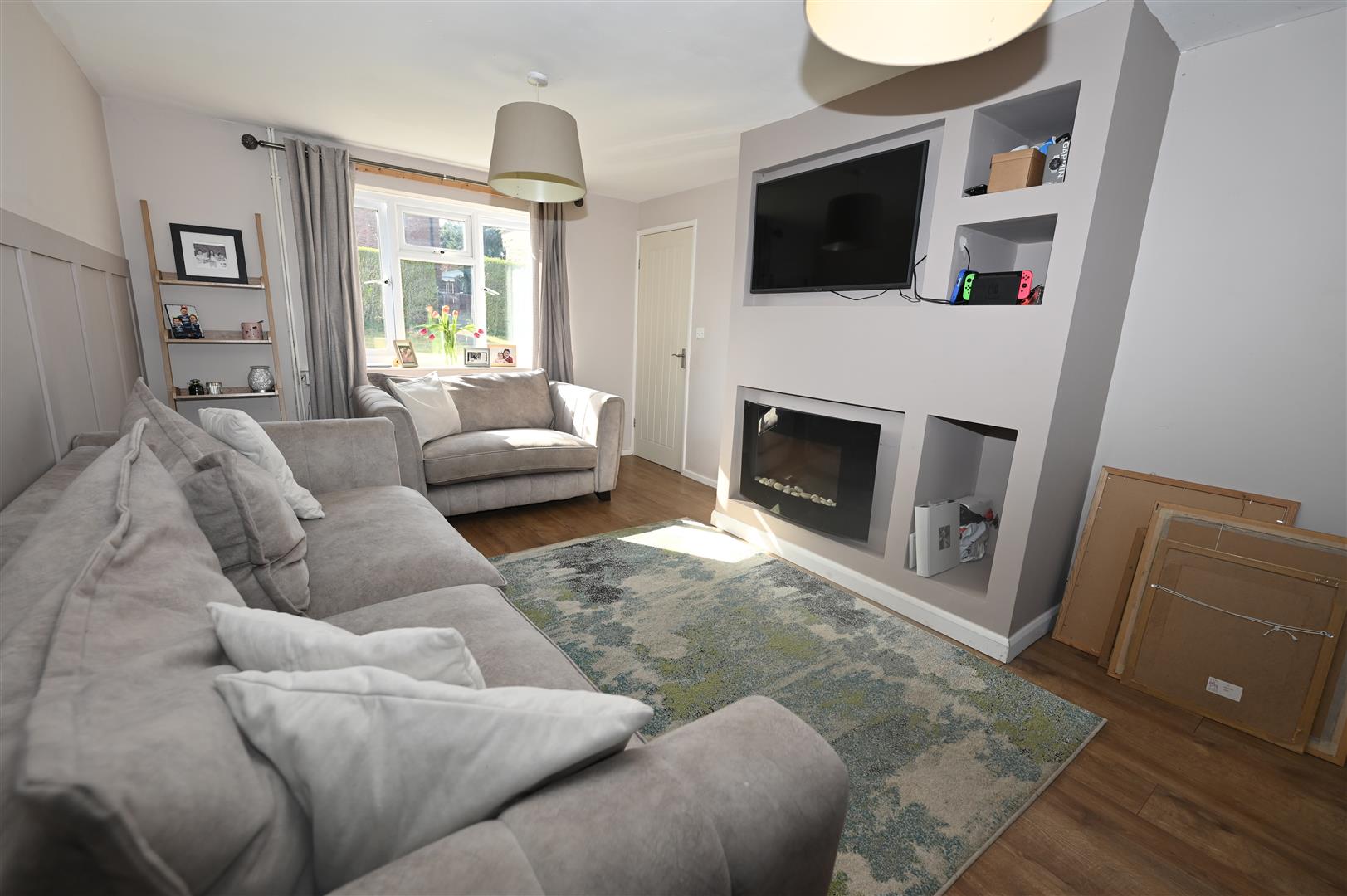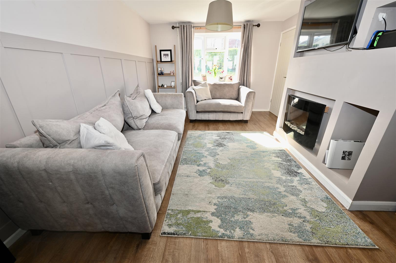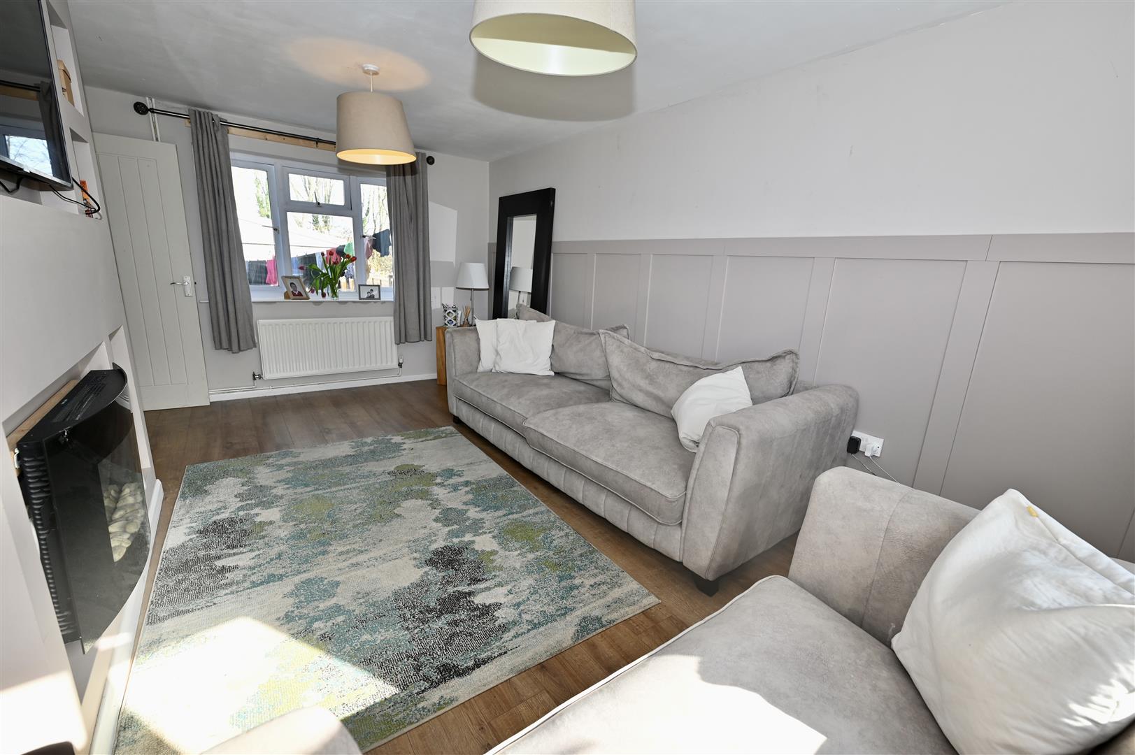 A large dual aspect room having UPVC double glazed windows to the front and the rear. Media wall with electric fire, feature panelled wall and two central heating radiators.