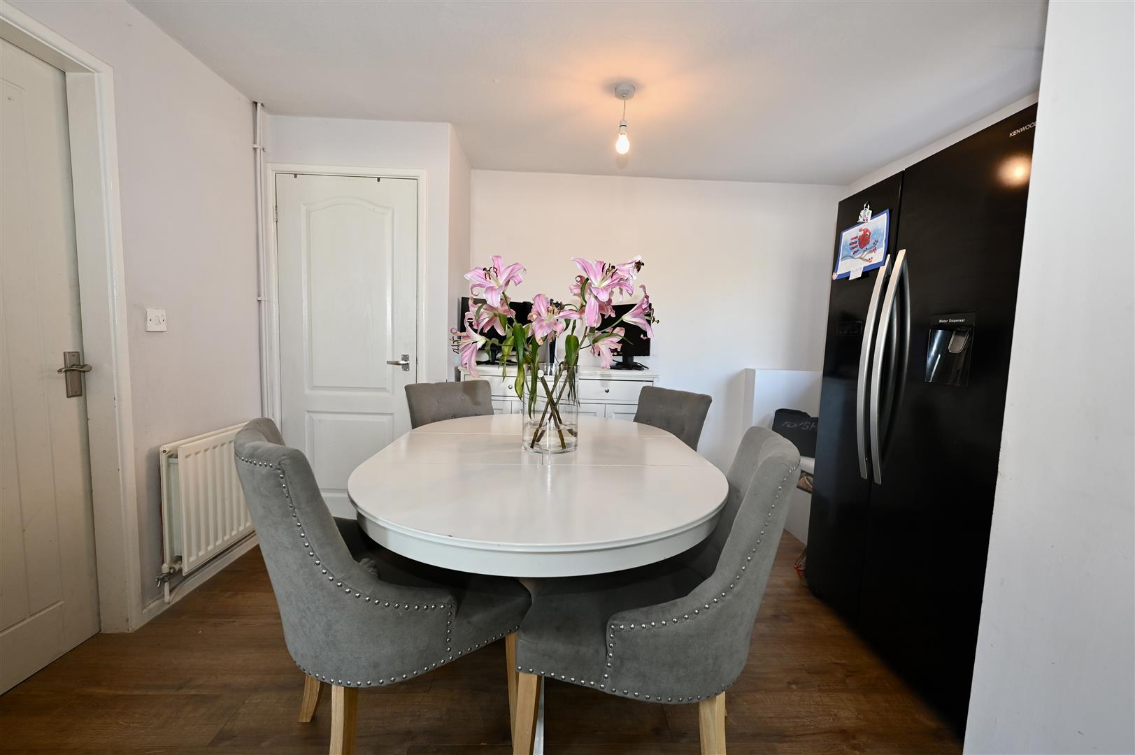 With wooden effect flooring, central heating radiator and staircase leading to the first floor. Doors lead into the lounge and the bathroom.