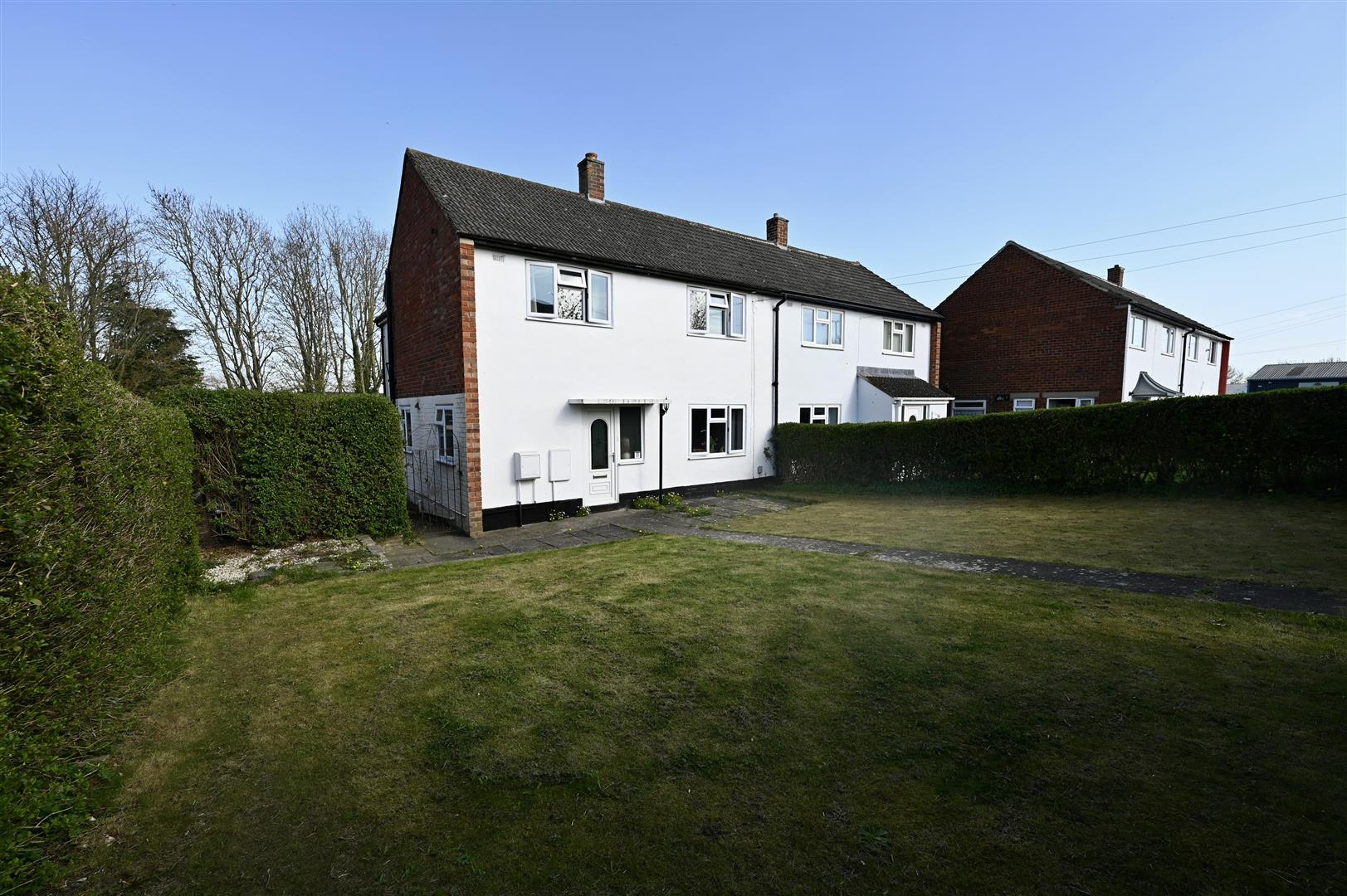 At the front there is a patio area and lawned garden surrounded by mature hedging.