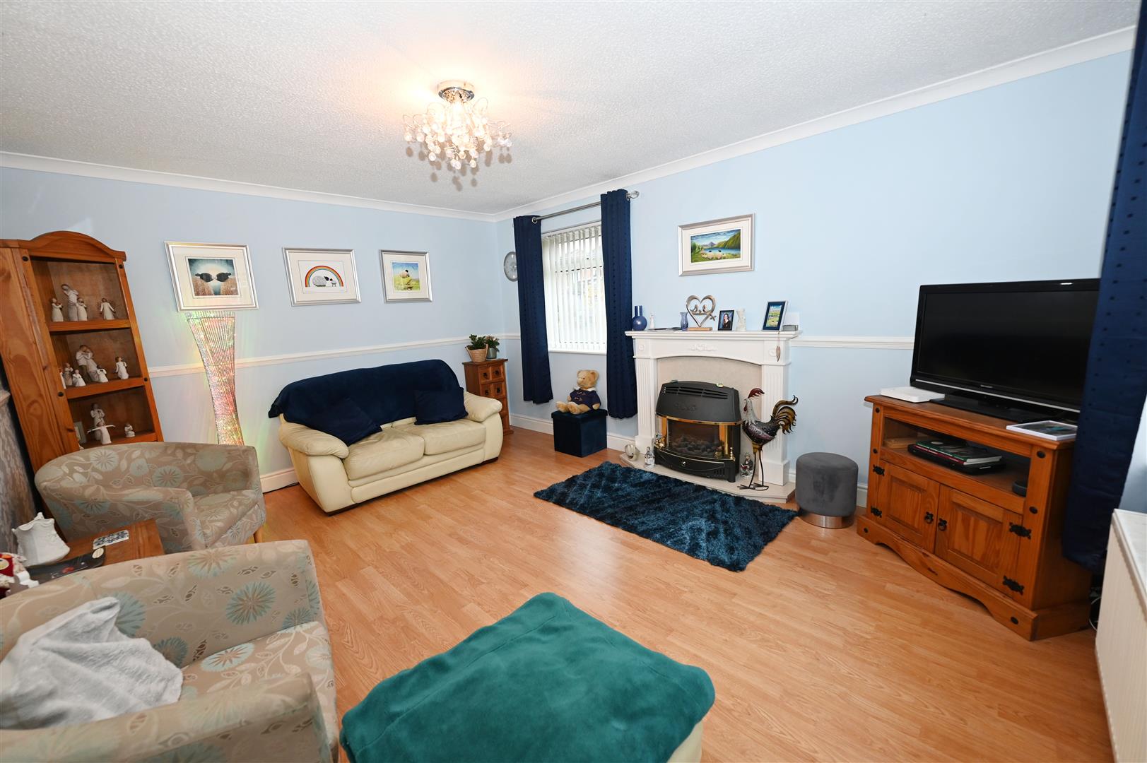 Fireplace with ‘Living-flame’ gas fire, UPVC double-glazed bow window to front & UPVC double-glazed window to side.