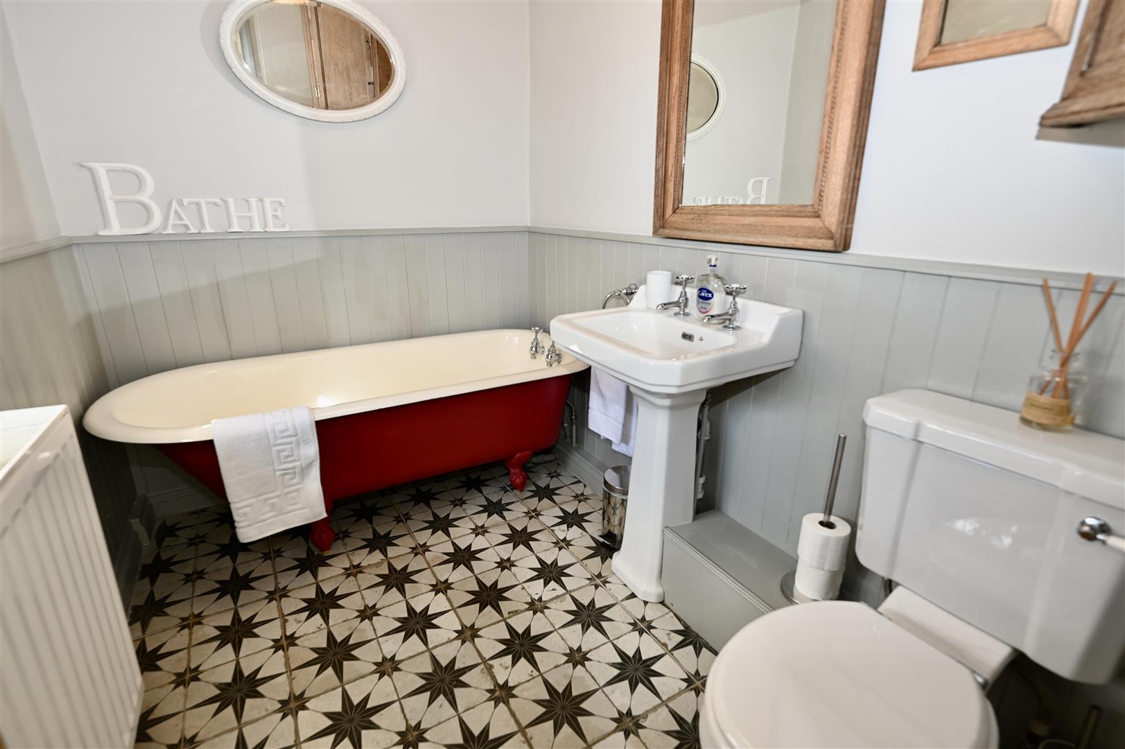 With a free standing cast iron roll top bath, wash hand basin, w.c, feature tiled flooring, half panelled walls, central heating radiator, coving and a window to the rear.