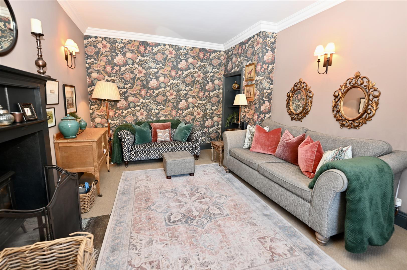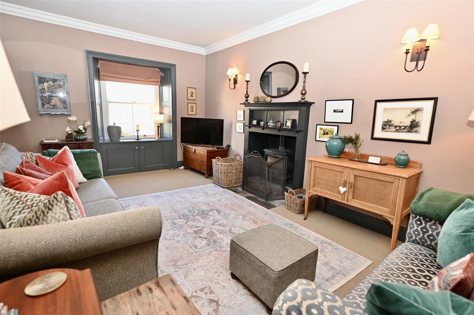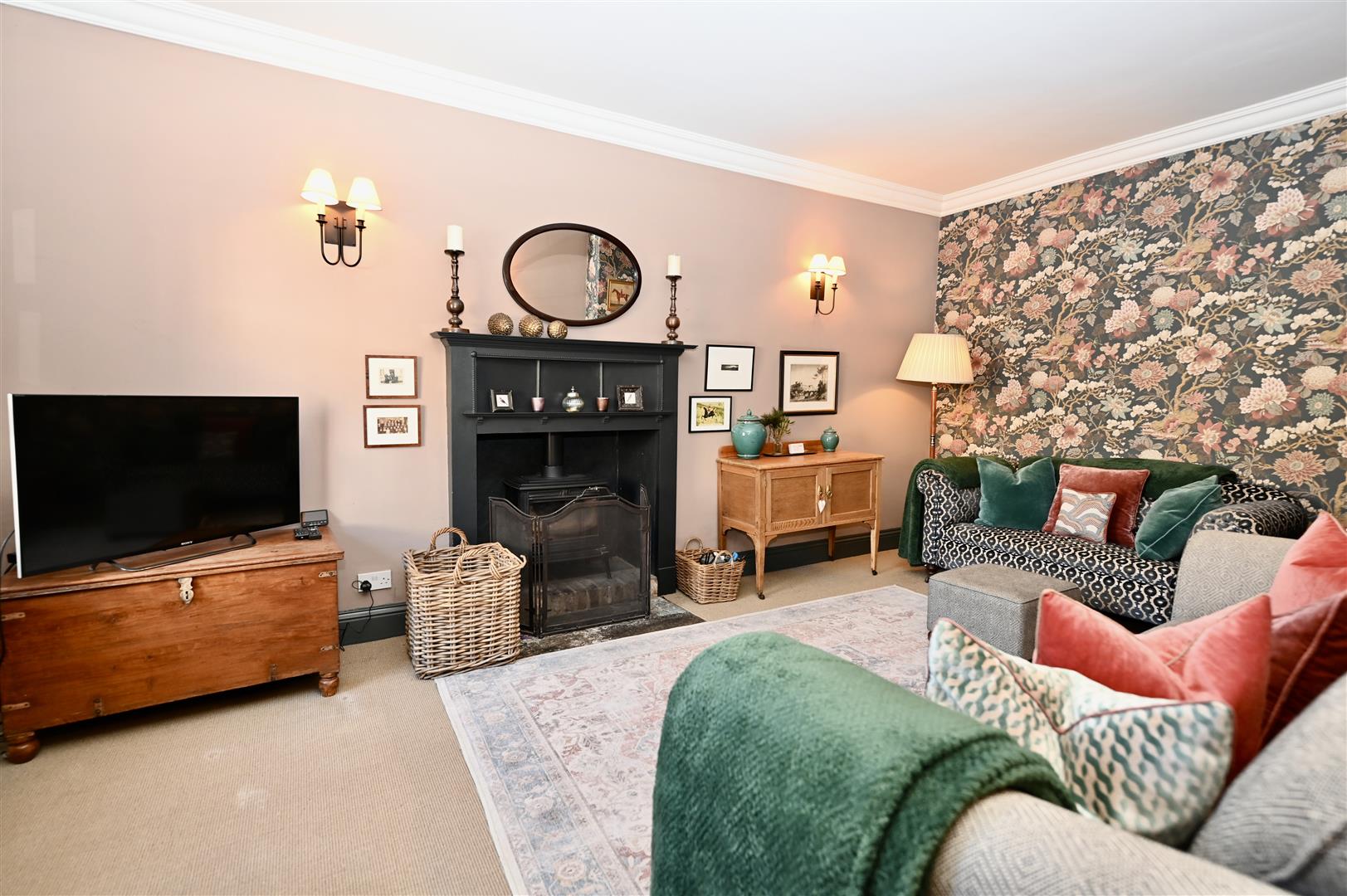 A generous sized room with a feature fireplace housing a log burning stove with a a brick hearth, recessed shelving unit, central heating radiator, 3 wall lights, coving, sliding sash window with period panelled casement and window seat with cupboard beneath.