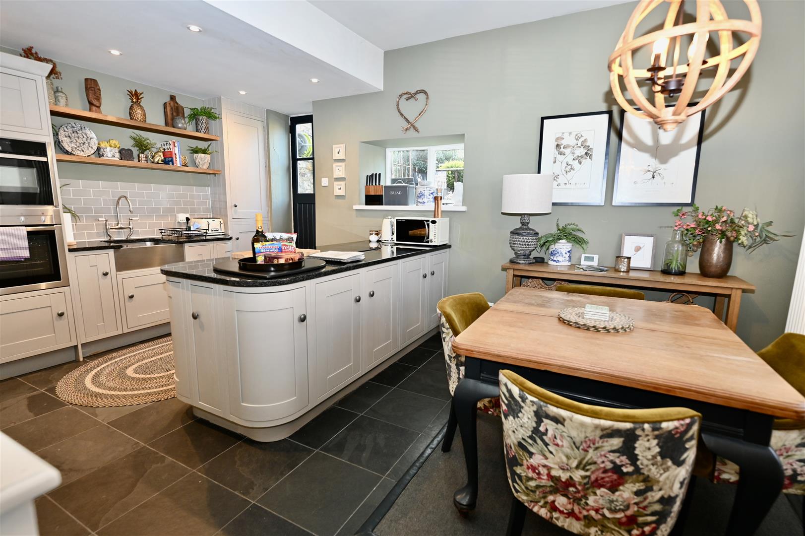 To the rear of the room is the kitchen area which has a range of wall, base and drawer units with granite worktops, Large part glazed dresser unit, Neff double tower oven, stainless steel sink unit with a mixer tap over, wall shelving, Worcester boiler, integrated fridge and freezer, spot lights, vertical central heating radiator. Stone steps lead up to the rear garden and a door leads to the downstairs cloakroom. there is a large feature island unit in the middle of the room with base and drawer units, integrated dishwasher and an electric hob.