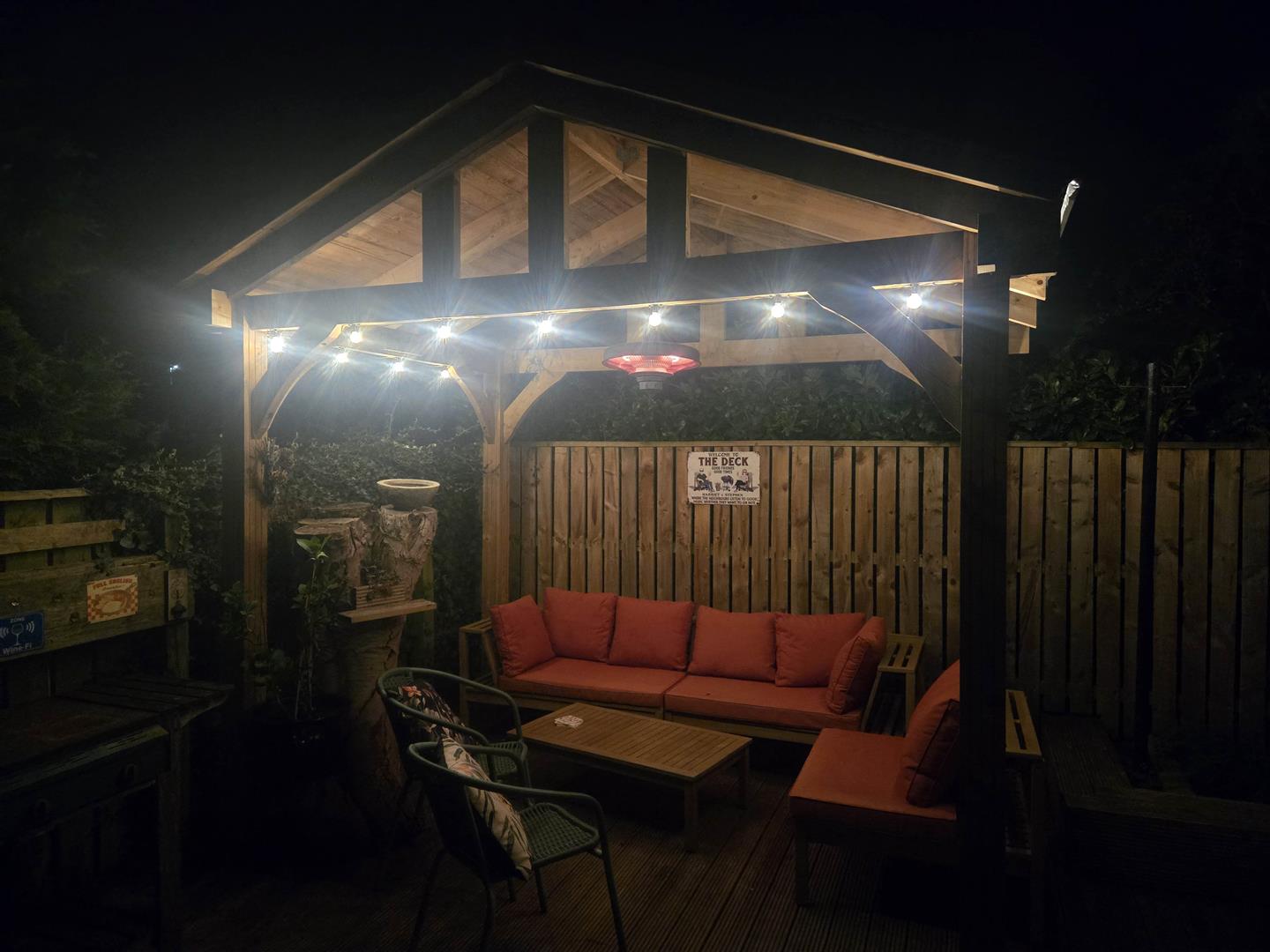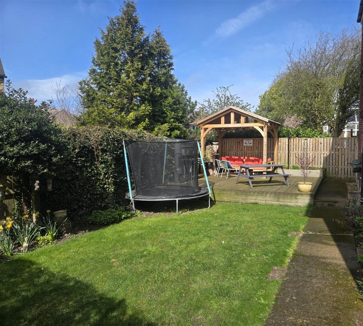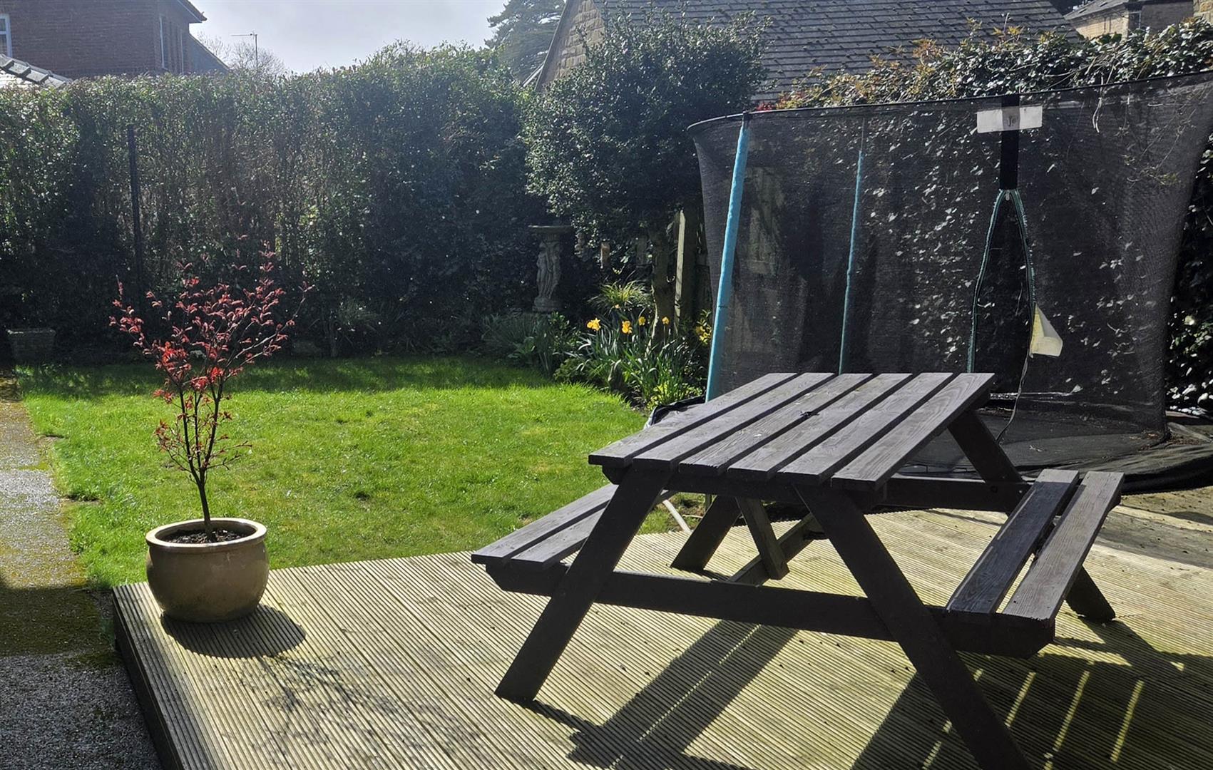 A great screened garden, ideal for entertaining: lawn with herbs & flower/shrub border, raised decked area with Pergola Flagged & BBQ area, light, outside power socket & cold-water tap. Gate to side storage area.