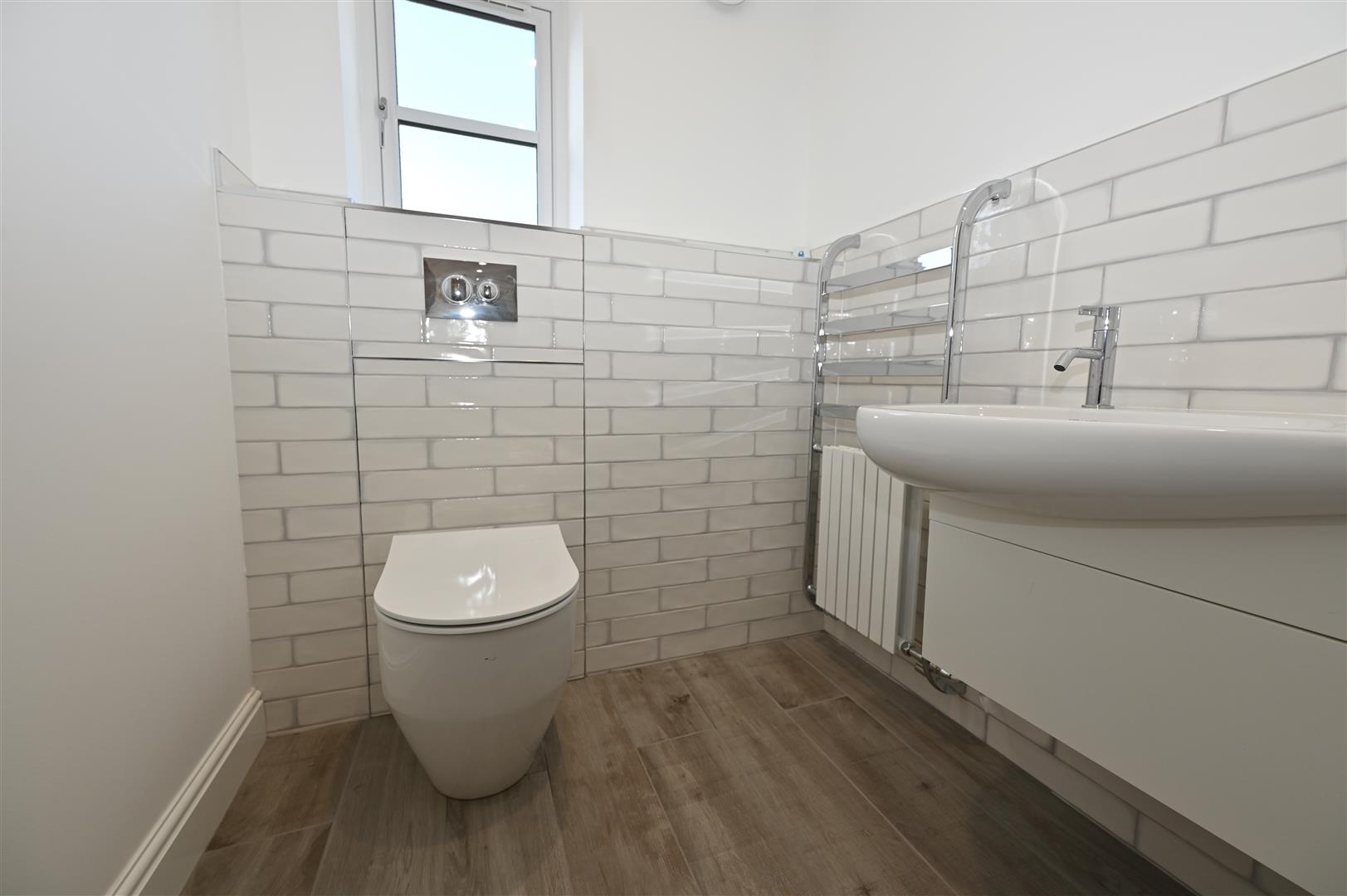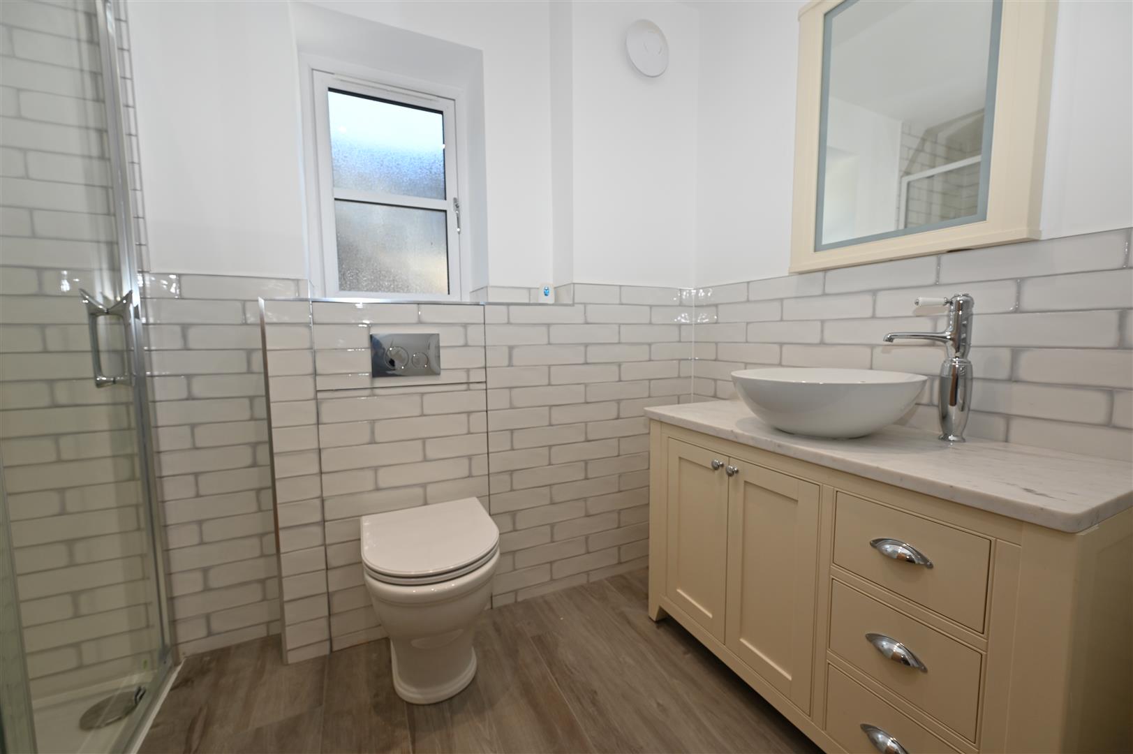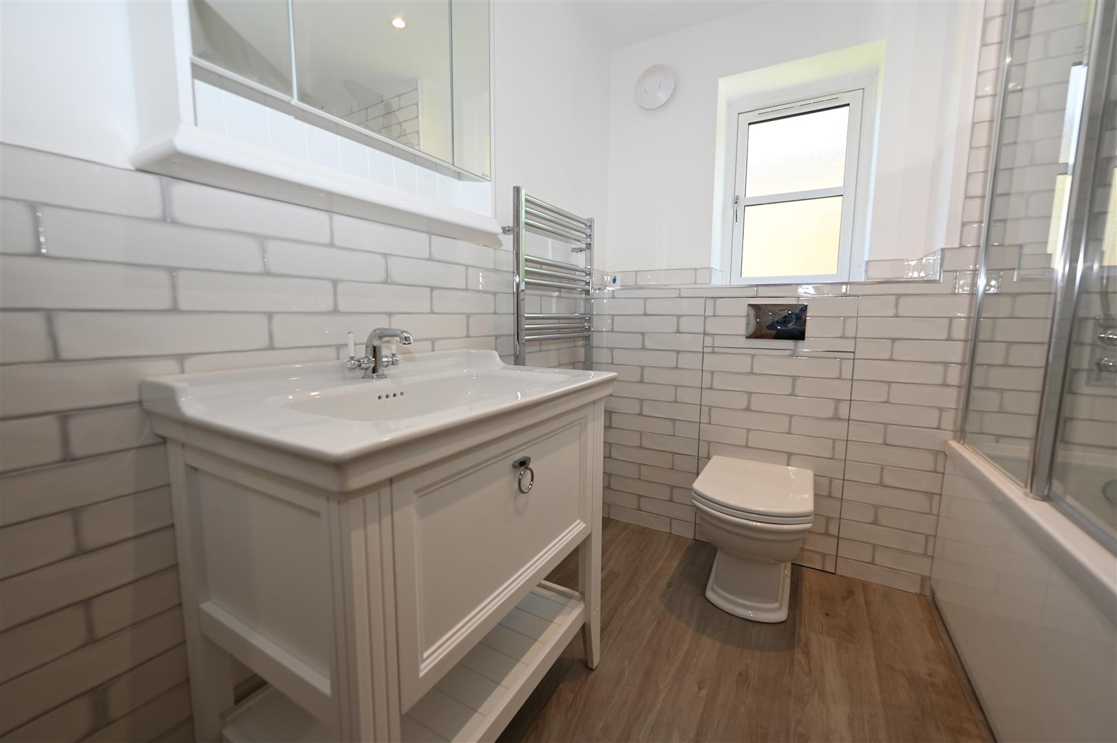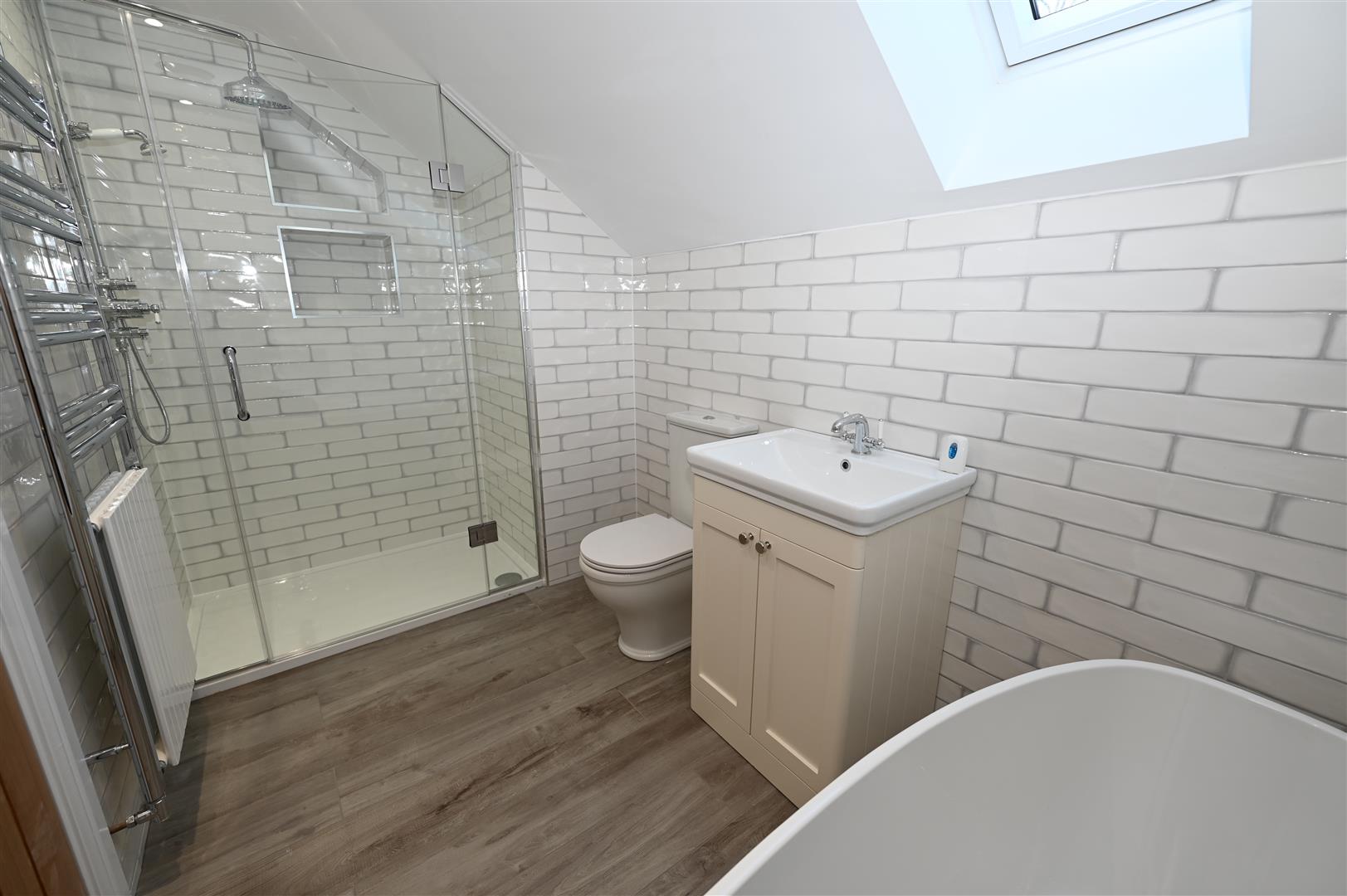Shower area, Waters ‘overflow system’ bath, inset washbasin with cupboards & push-flush WC. Fully tiled, tiled nooks, down-lighting & double-glazed Velux window.