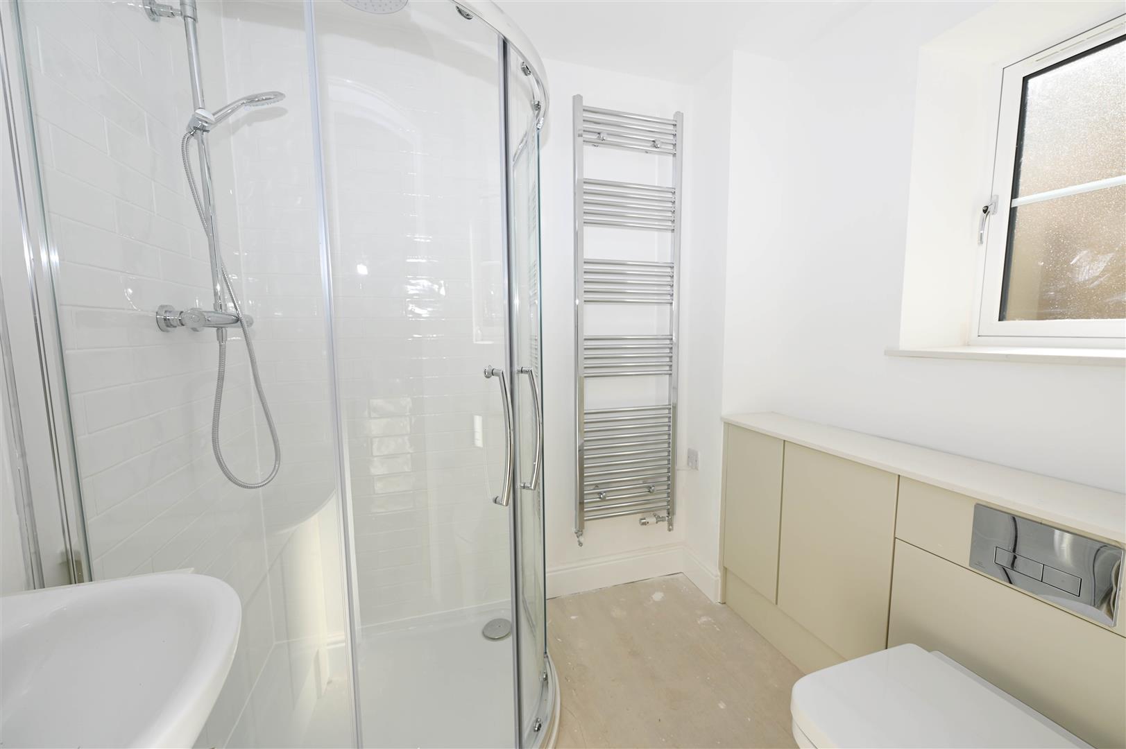 Corner shower cubicle with riser & diverter bar shower, vanity unit washbasin & WC. Window to side.