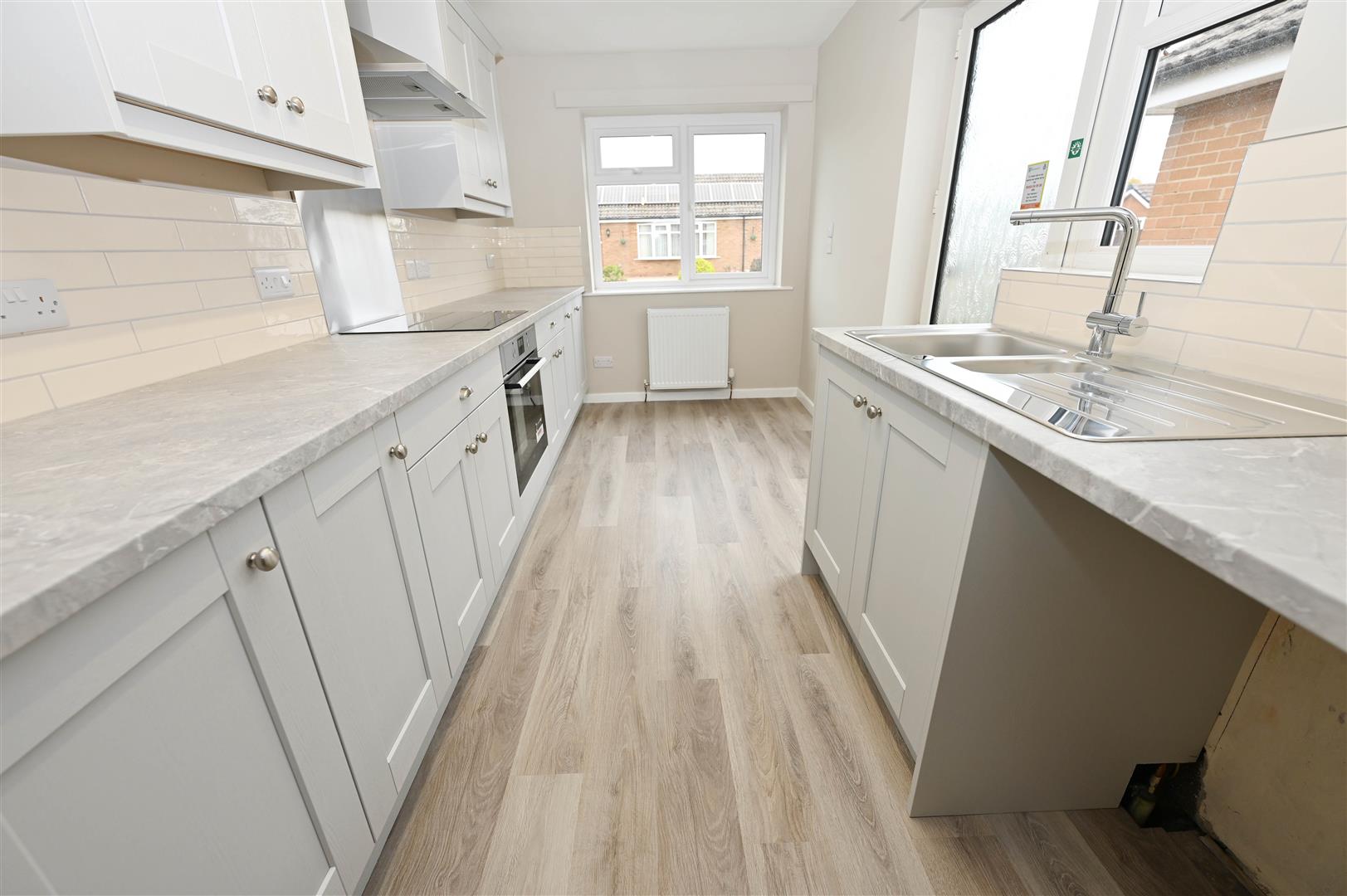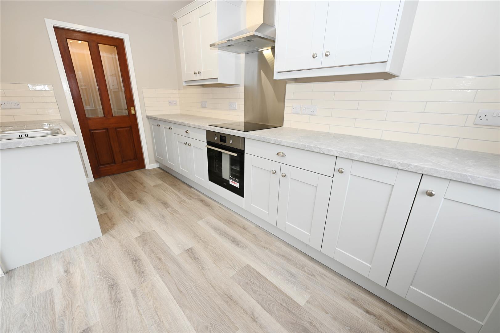 UPVC door leading into kitchen with UPVC window to front and side. Fitted with contemporary base, drawer and wall units with one and half sink unit fed by mixer tap. Four ring induction hob, below oven and above extractor hood. Laminate floor, brick thing to splash areas, central heating radiator, void for washing machine and door to inner hallway.