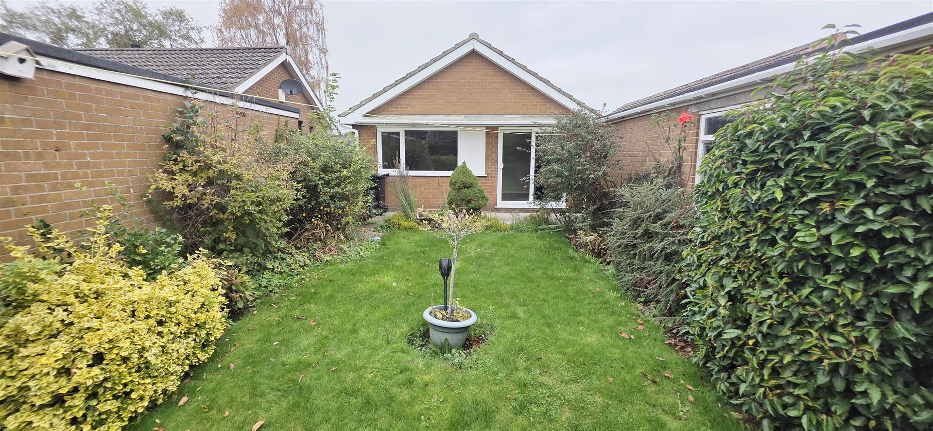 Driveway & lawn with flower/shrub bed & border. Side flagged driveway with cold-water tap & outside light, & leading to:
